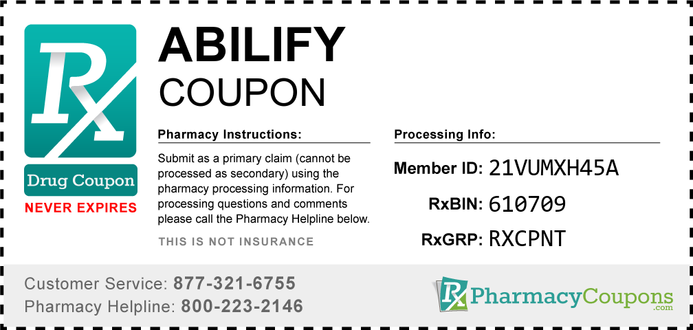 Simply bring the coupon below to the pharmacy, and save on Abilify at CVS, Walgreens, Publix, Safeway, Albertsons, Rite Aid, Target, and many other drug stores! These coupons are free and can be used to save up to 80% on all medications.