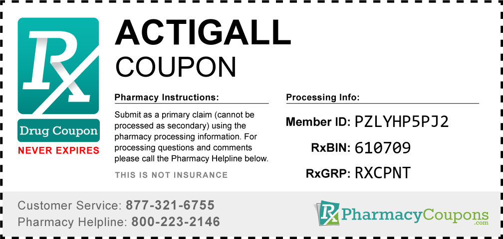 Simply bring the coupon below to the pharmacy, and save on Actigall at CVS, Walgreens, Publix, Safeway, Albertsons, Rite Aid, Target, and many other drug stores! These coupons are free and can be used to save up to 80% on all medications.