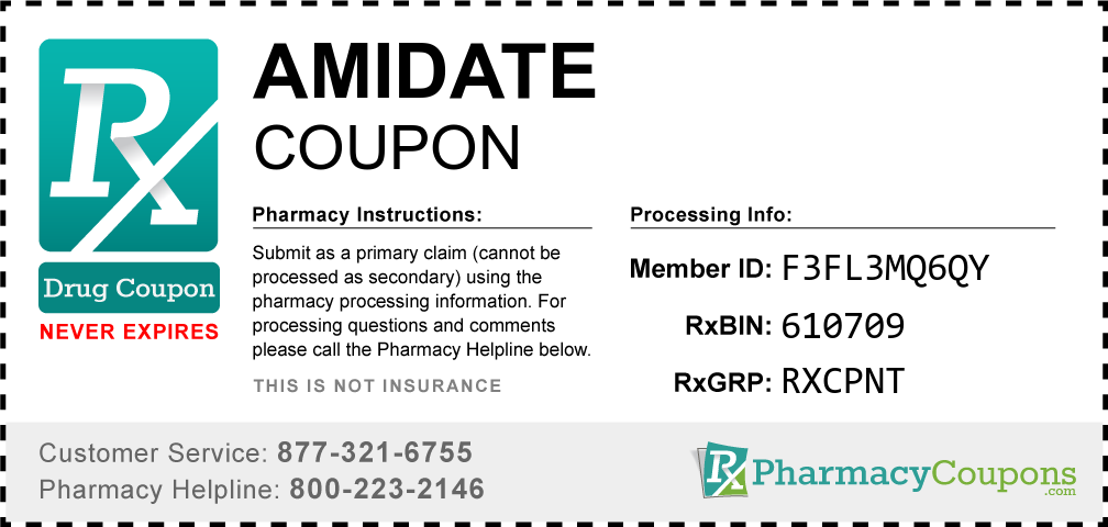 Simply bring the coupon below to the pharmacy, and save on Amidate at CVS, Walgreens, Publix, Safeway, Albertsons, Rite Aid, Target, and many other drug stores! These coupons are free and can be used to save up to 80% on all medications.