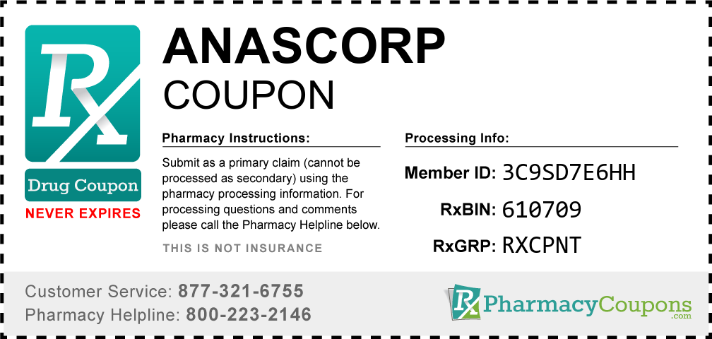 Simply bring the coupon below to the pharmacy, and save on Anascorp at CVS, Walgreens, Publix, Safeway, Albertsons, Rite Aid, Target, and many other drug stores! These coupons are free and can be used to save up to 80% on all medications.