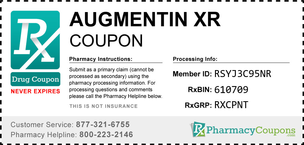Simply bring the coupon below to the pharmacy, and save on Augmentin xr at CVS, Walgreens, Publix, Safeway, Albertsons, Rite Aid, Target, and many other drug stores! These coupons are free and can be used to save up to 80% on all medications.