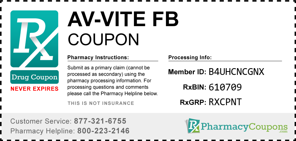 Simply bring the coupon below to the pharmacy, and save on Av-vite fb at CVS, Walgreens, Publix, Safeway, Albertsons, Rite Aid, Target, and many other drug stores! These coupons are free and can be used to save up to 80% on all medications.