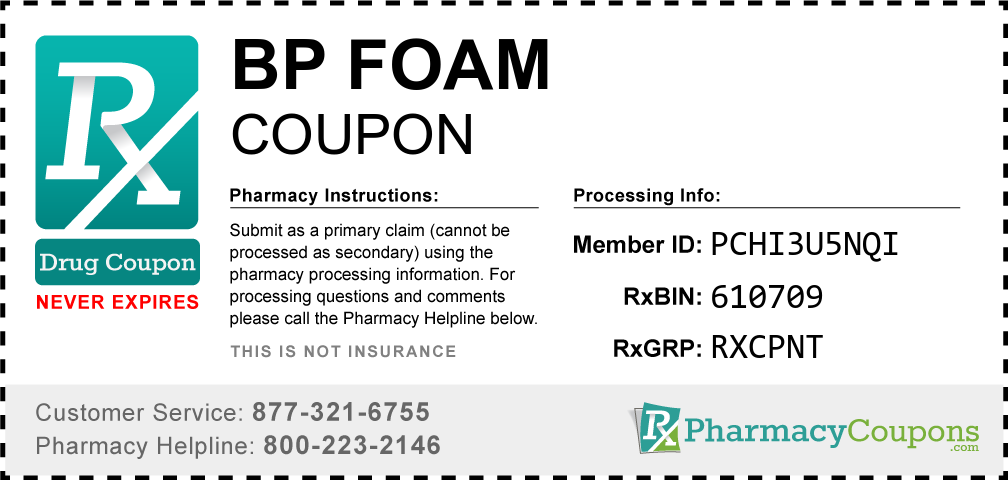 Simply bring the coupon below to the pharmacy, and save on Bp foam at CVS, Walgreens, Publix, Safeway, Albertsons, Rite Aid, Target, and many other drug stores! These coupons are free and can be used to save up to 80% on all medications.