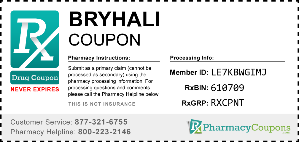Simply bring the coupon below to the pharmacy, and save on Bryhali at CVS, Walgreens, Publix, Safeway, Albertsons, Rite Aid, Target, and many other drug stores! These coupons are free and can be used to save up to 80% on all medications.