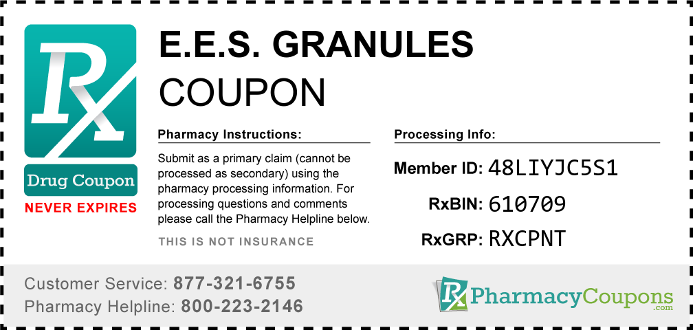 Simply bring the coupon below to the pharmacy, and save on E.e.s. granules at CVS, Walgreens, Publix, Safeway, Albertsons, Rite Aid, Target, and many other drug stores! These coupons are free and can be used to save up to 80% on all medications.
