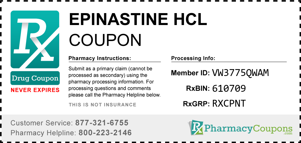 Simply bring the coupon below to the pharmacy, and save on Epinastine hcl at CVS, Walgreens, Publix, Safeway, Albertsons, Rite Aid, Target, and many other drug stores! These coupons are free and can be used to save up to 80% on all medications.