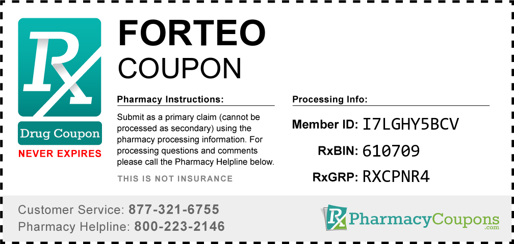 Simply bring the coupon below to the pharmacy, and save on Forteo at CVS, Walgreens, Publix, Safeway, Albertsons, Rite Aid, Target, and many other drug stores! These coupons are free and can be used to save up to 80% on all medications.