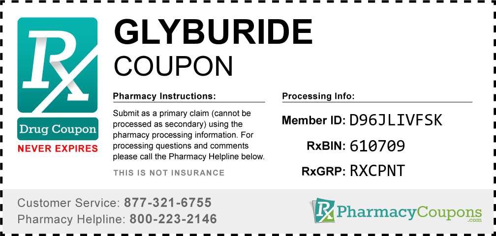 Simply bring the coupon below to the pharmacy, and save on Glyburide at CVS, Walgreens, Publix, Safeway, Albertsons, Rite Aid, Target, and many other drug stores! These coupons are free and can be used to save up to 80% on all medications.