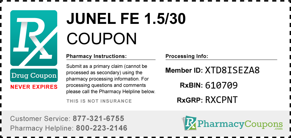 Simply bring the coupon below to the pharmacy, and save on Junel fe 1.5/30 at CVS, Walgreens, Publix, Safeway, Albertsons, Rite Aid, Target, and many other drug stores! These coupons are free and can be used to save up to 80% on all medications.