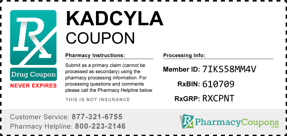 Simply bring the coupon below to the pharmacy, and save on Kadcyla at CVS, Walgreens, Publix, Safeway, Albertsons, Rite Aid, Target, and many other drug stores! These coupons are free and can be used to save up to 80% on all medications.