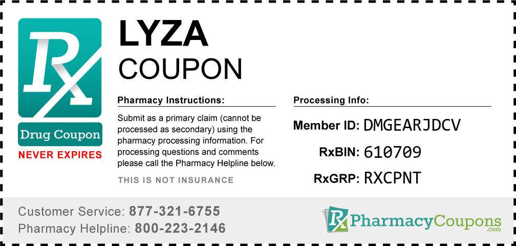Simply bring the coupon below to the pharmacy, and save on Lyza at CVS, Walgreens, Publix, Safeway, Albertsons, Rite Aid, Target, and many other drug stores! These coupons are free and can be used to save up to 80% on all medications.