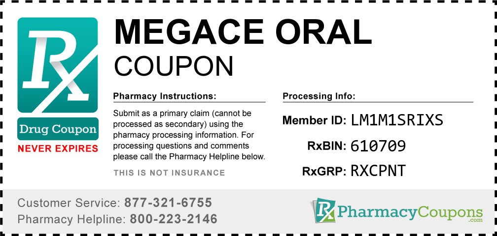 Simply bring the coupon below to the pharmacy, and save on Megace oral at CVS, Walgreens, Publix, Safeway, Albertsons, Rite Aid, Target, and many other drug stores! These coupons are free and can be used to save up to 80% on all medications.