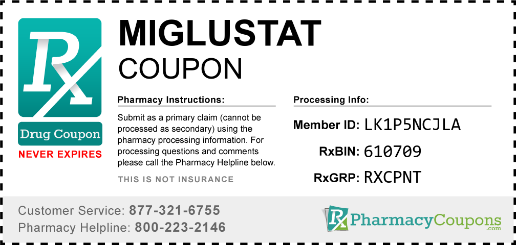 Simply bring the coupon below to the pharmacy, and save on Miglustat at CVS, Walgreens, Publix, Safeway, Albertsons, Rite Aid, Target, and many other drug stores! These coupons are free and can be used to save up to 80% on all medications.