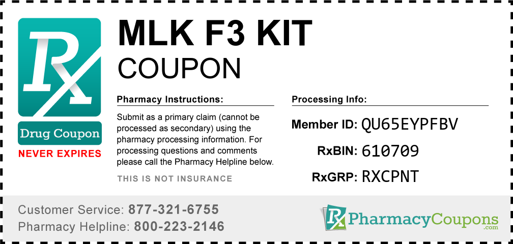 Simply bring the coupon below to the pharmacy, and save on Mlk f3 kit at CVS, Walgreens, Publix, Safeway, Albertsons, Rite Aid, Target, and many other drug stores! These coupons are free and can be used to save up to 80% on all medications.