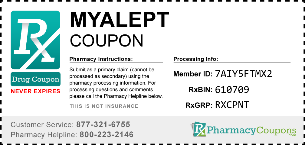 Simply bring the coupon below to the pharmacy, and save on Myalept at CVS, Walgreens, Publix, Safeway, Albertsons, Rite Aid, Target, and many other drug stores! These coupons are free and can be used to save up to 80% on all medications.