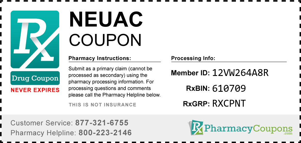 Simply bring the coupon below to the pharmacy, and save on Neuac at CVS, Walgreens, Publix, Safeway, Albertsons, Rite Aid, Target, and many other drug stores! These coupons are free and can be used to save up to 80% on all medications.