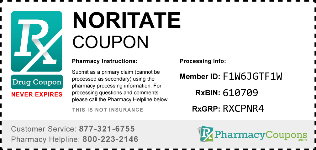 Simply bring the coupon below to the pharmacy, and save on Noritate at CVS, Walgreens, Publix, Safeway, Albertsons, Rite Aid, Target, and many other drug stores! These coupons are free and can be used to save up to 80% on all medications.