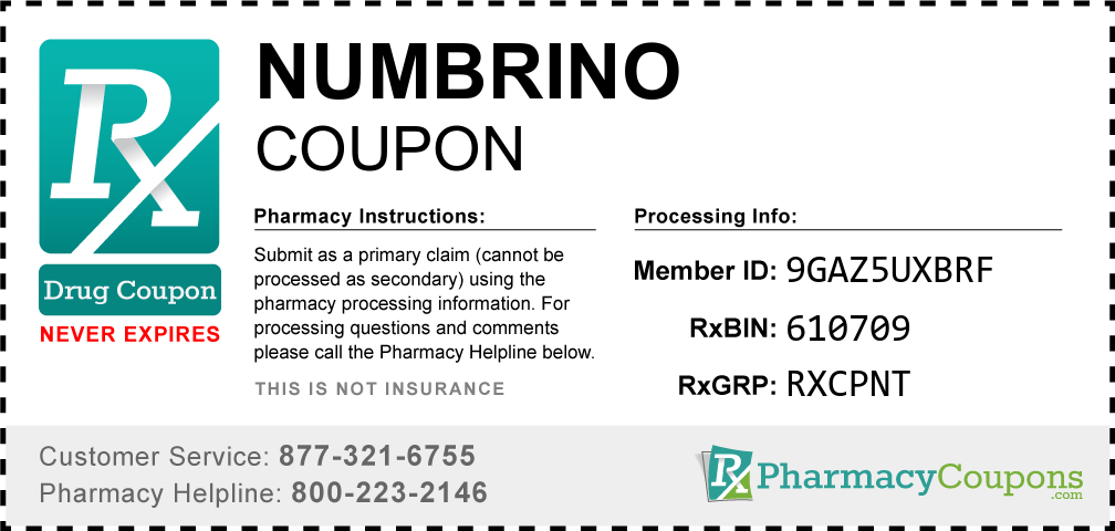 Simply bring the coupon below to the pharmacy, and save on Numbrino at CVS, Walgreens, Publix, Safeway, Albertsons, Rite Aid, Target, and many other drug stores! These coupons are free and can be used to save up to 80% on all medications.