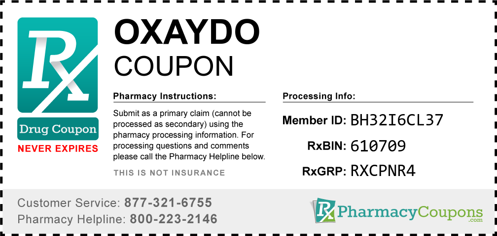 Simply bring the coupon below to the pharmacy, and save on Oxaydo at CVS, Walgreens, Publix, Safeway, Albertsons, Rite Aid, Target, and many other drug stores! These coupons are free and can be used to save up to 80% on all medications.