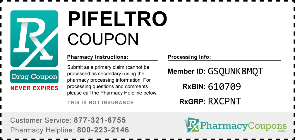 Simply bring the coupon below to the pharmacy, and save on Pifeltro at CVS, Walgreens, Publix, Safeway, Albertsons, Rite Aid, Target, and many other drug stores! These coupons are free and can be used to save up to 80% on all medications.