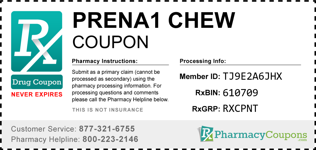 Simply bring the coupon below to the pharmacy, and save on Prena1 chew at CVS, Walgreens, Publix, Safeway, Albertsons, Rite Aid, Target, and many other drug stores! These coupons are free and can be used to save up to 80% on all medications.