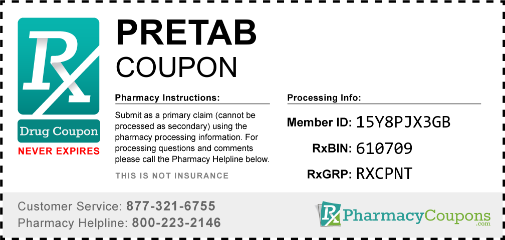 Simply bring the coupon below to the pharmacy, and save on Pretab at CVS, Walgreens, Publix, Safeway, Albertsons, Rite Aid, Target, and many other drug stores! These coupons are free and can be used to save up to 80% on all medications.