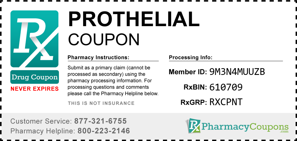 Simply bring the coupon below to the pharmacy, and save on Prothelial at CVS, Walgreens, Publix, Safeway, Albertsons, Rite Aid, Target, and many other drug stores! These coupons are free and can be used to save up to 80% on all medications.