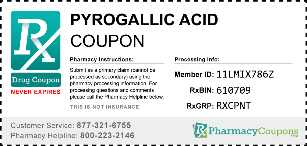 Simply bring the coupon below to the pharmacy, and save on Pyrogallic acid at CVS, Walgreens, Publix, Safeway, Albertsons, Rite Aid, Target, and many other drug stores! These coupons are free and can be used to save up to 80% on all medications.