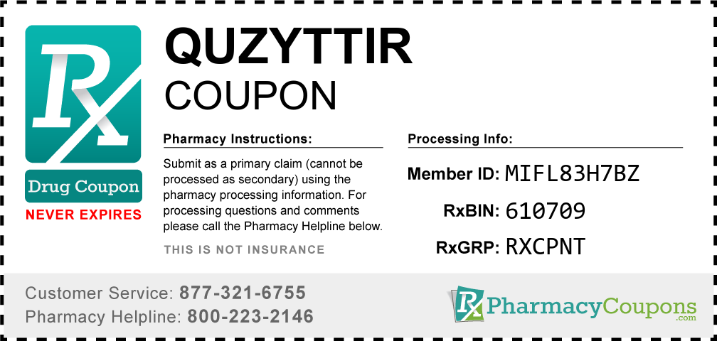 Simply bring the coupon below to the pharmacy, and save on Quzyttir at CVS, Walgreens, Publix, Safeway, Albertsons, Rite Aid, Target, and many other drug stores! These coupons are free and can be used to save up to 80% on all medications.