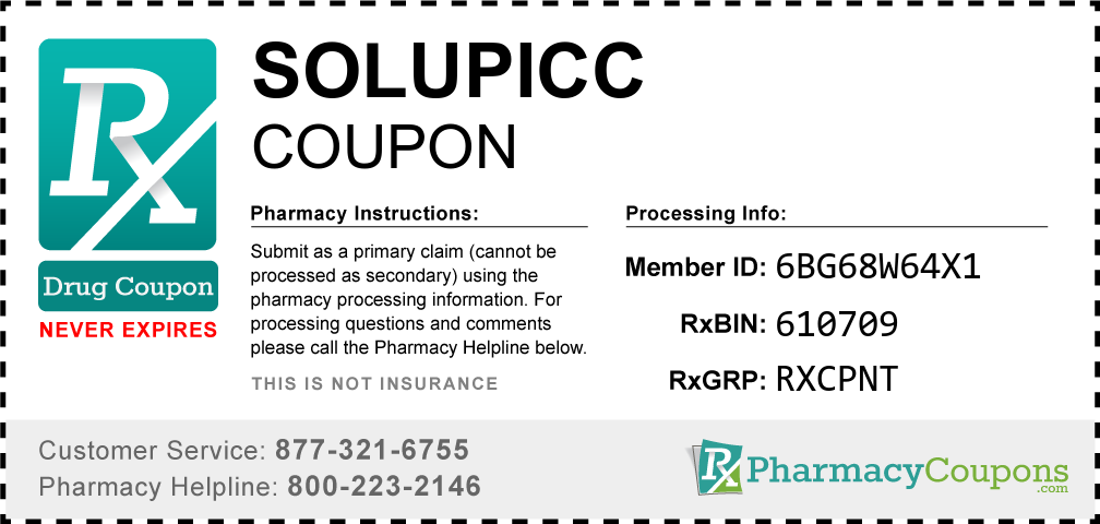 Simply bring the coupon below to the pharmacy, and save on Solupicc at CVS, Walgreens, Publix, Safeway, Albertsons, Rite Aid, Target, and many other drug stores! These coupons are free and can be used to save up to 80% on all medications.