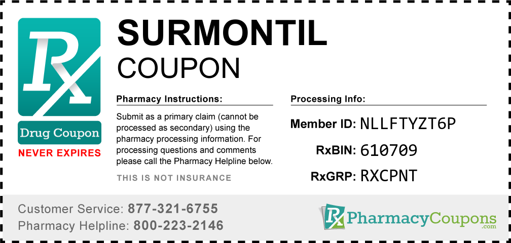 Simply bring the coupon below to the pharmacy, and save on Surmontil at CVS, Walgreens, Publix, Safeway, Albertsons, Rite Aid, Target, and many other drug stores! These coupons are free and can be used to save up to 80% on all medications.