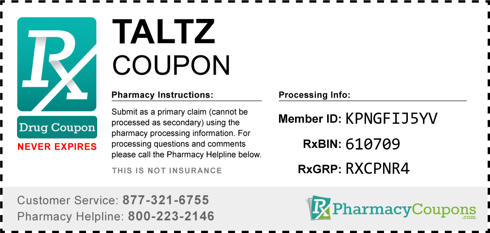 Simply bring the coupon below to the pharmacy, and save on Taltz at CVS, Walgreens, Publix, Safeway, Albertsons, Rite Aid, Target, and many other drug stores! These coupons are free and can be used to save up to 80% on all medications.