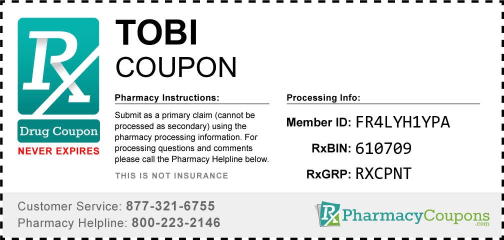 Simply bring the coupon below to the pharmacy, and save on Tobi at CVS, Walgreens, Publix, Safeway, Albertsons, Rite Aid, Target, and many other drug stores! These coupons are free and can be used to save up to 80% on all medications.