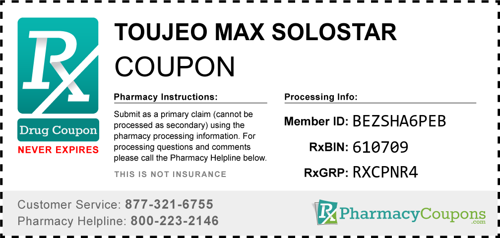 Simply bring the coupon below to the pharmacy, and save on Toujeo max solostar at CVS, Walgreens, Publix, Safeway, Albertsons, Rite Aid, Target, and many other drug stores! These coupons are free and can be used to save up to 80% on all medications.