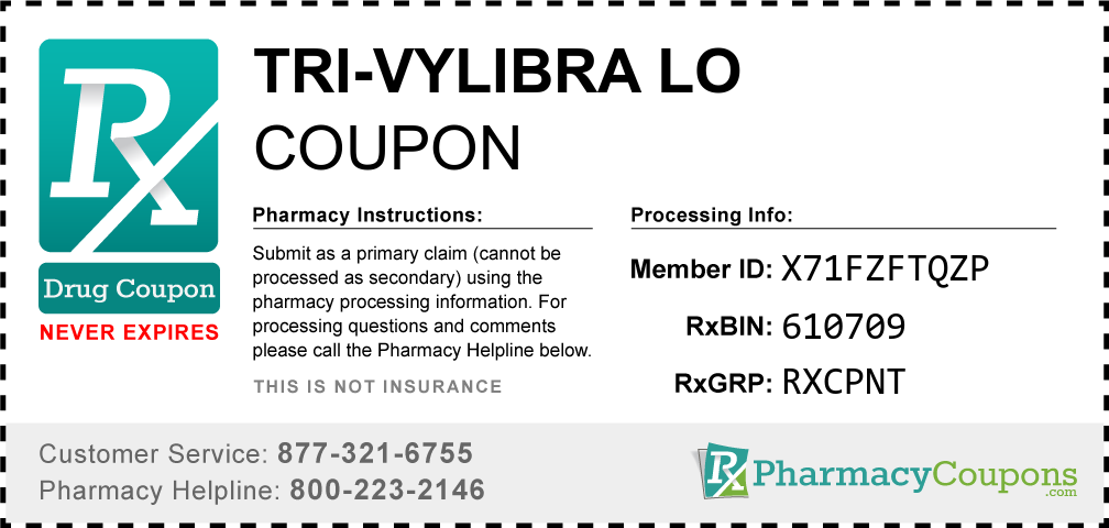 Simply bring the coupon below to the pharmacy, and save on Tri-vylibra lo at CVS, Walgreens, Publix, Safeway, Albertsons, Rite Aid, Target, and many other drug stores! These coupons are free and can be used to save up to 80% on all medications.