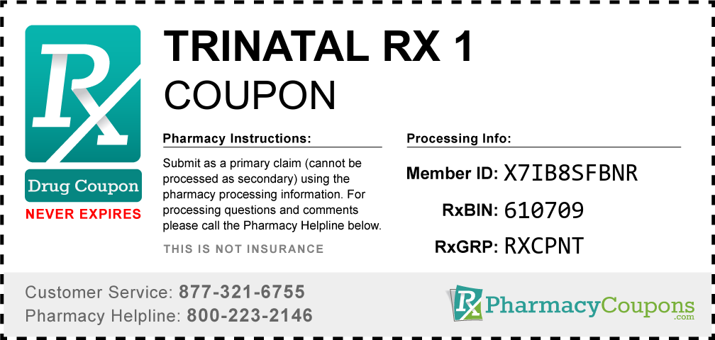 Simply bring the coupon below to the pharmacy, and save on Trinatal rx 1 at CVS, Walgreens, Publix, Safeway, Albertsons, Rite Aid, Target, and many other drug stores! These coupons are free and can be used to save up to 80% on all medications.