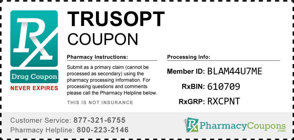 Simply bring the coupon below to the pharmacy, and save on Trusopt at CVS, Walgreens, Publix, Safeway, Albertsons, Rite Aid, Target, and many other drug stores! These coupons are free and can be used to save up to 80% on all medications.