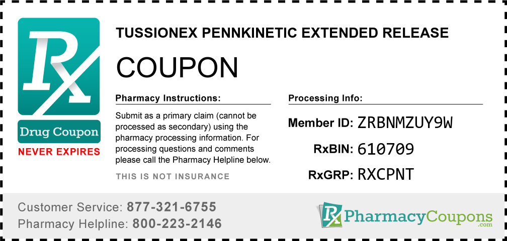 Simply bring the coupon below to the pharmacy, and save on Tussionex pennkinetic extended release at CVS, Walgreens, Publix, Safeway, Albertsons, Rite Aid, Target, and many other drug stores! These coupons are free and can be used to save up to 80% on all medications.