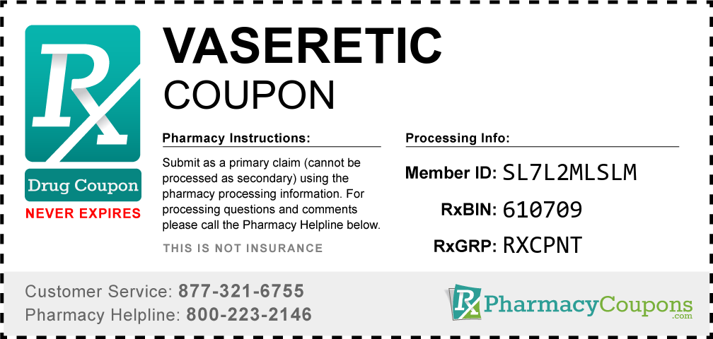 Simply bring the coupon below to the pharmacy, and save on Vaseretic at CVS, Walgreens, Publix, Safeway, Albertsons, Rite Aid, Target, and many other drug stores! These coupons are free and can be used to save up to 80% on all medications.