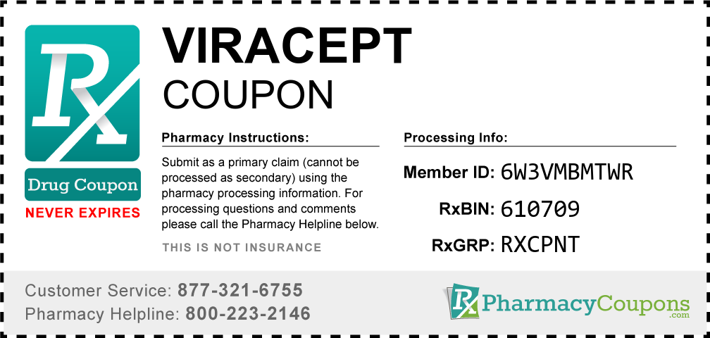 Simply bring the coupon below to the pharmacy, and save on Viracept at CVS, Walgreens, Publix, Safeway, Albertsons, Rite Aid, Target, and many other drug stores! These coupons are free and can be used to save up to 80% on all medications.