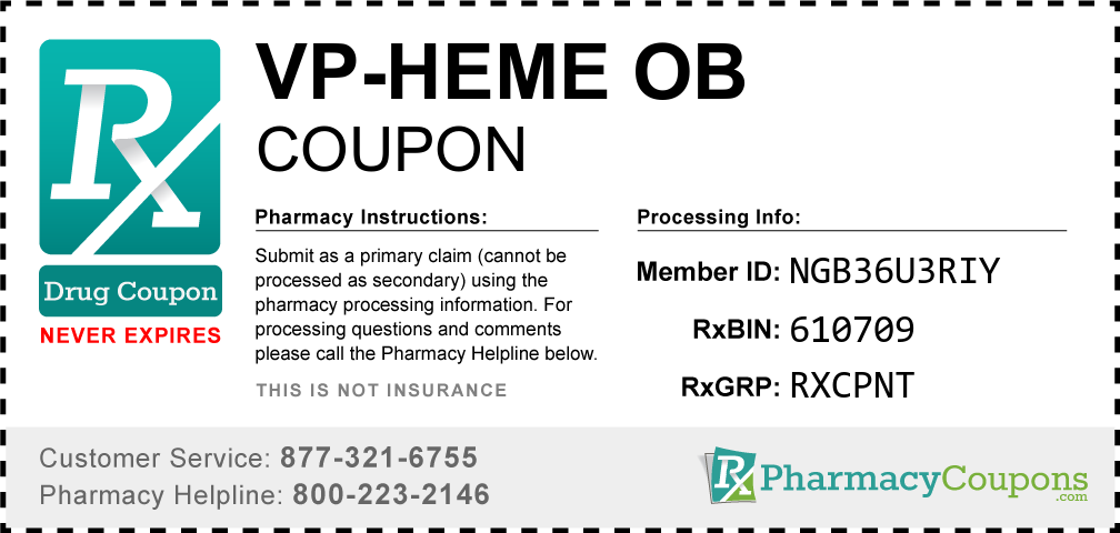 Simply bring the coupon below to the pharmacy, and save on Vp-heme ob at CVS, Walgreens, Publix, Safeway, Albertsons, Rite Aid, Target, and many other drug stores! These coupons are free and can be used to save up to 80% on all medications.