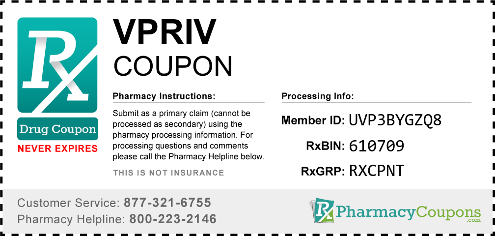 Simply bring the coupon below to the pharmacy, and save on Vpriv at CVS, Walgreens, Publix, Safeway, Albertsons, Rite Aid, Target, and many other drug stores! These coupons are free and can be used to save up to 80% on all medications.