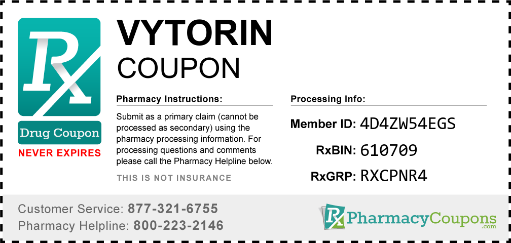 Simply bring the coupon below to the pharmacy, and save on Vytorin at CVS, Walgreens, Publix, Safeway, Albertsons, Rite Aid, Target, and many other drug stores! These coupons are free and can be used to save up to 80% on all medications.