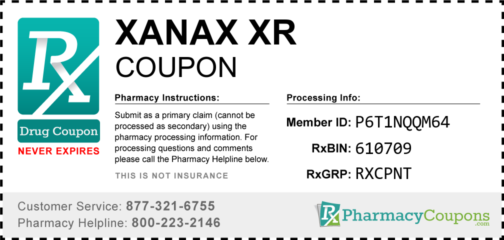 Simply bring the coupon below to the pharmacy, and save on Xanax xr at CVS, Walgreens, Publix, Safeway, Albertsons, Rite Aid, Target, and many other drug stores! These coupons are free and can be used to save up to 80% on all medications.
