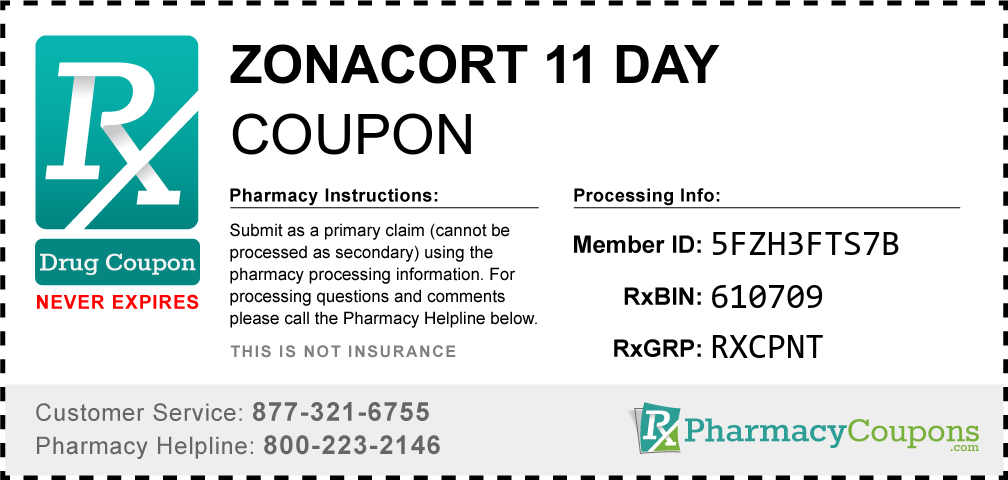 Simply bring the coupon below to the pharmacy, and save on Zonacort 11 day at CVS, Walgreens, Publix, Safeway, Albertsons, Rite Aid, Target, and many other drug stores! These coupons are free and can be used to save up to 80% on all medications.