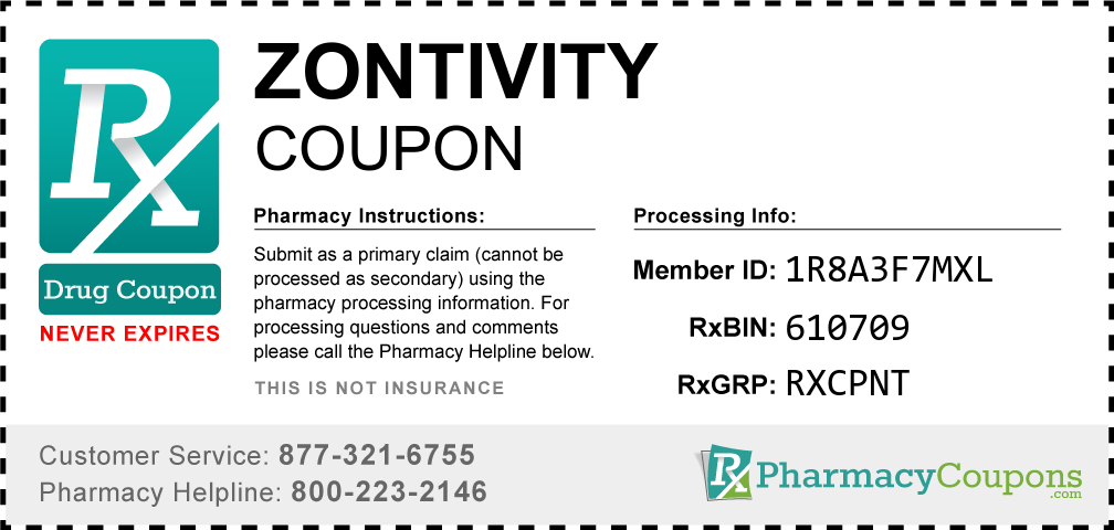 Simply bring the coupon below to the pharmacy, and save on Zontivity at CVS, Walgreens, Publix, Safeway, Albertsons, Rite Aid, Target, and many other drug stores! These coupons are free and can be used to save up to 80% on all medications.